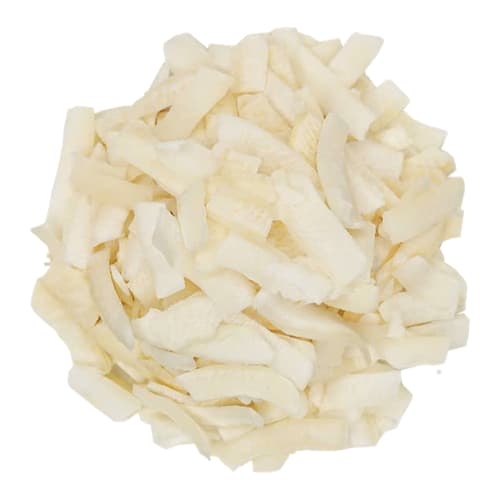 Dừa sấy giòn được chế biến từ 100% cơm dừa tươi ngon, cắt mỏng đều tạo nên những miếng dừa giòn rụm, giữ nguyên màu trắng tinh khiết và hương thơm đặc trưng tự nhiên của dừa tươi. Cơm dừa sau khi thu hoạch được làm sạch kỹ càng, loại bỏ tạp chất rồi đưa vào quy trình sấy thăng hoa hiện đại, giúp sản phẩm giữ được độ giòn, màu sắc và hương vị tươi mới như quả dừa tươi.